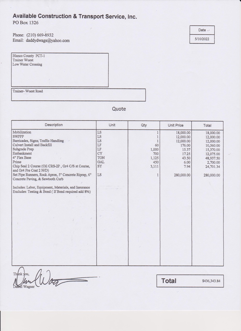 CASE INDEX: CASE: BLANCO COUNTY: TRAINER WUEST LOW WATER CROSSING & ROAD RE-ALIGNMENT PROJECT: This capital budget case centered on construction of a low water crossing and associated road re-alignment. Clickable documents below are shown in the order of relevance or sequence within the article. • Main Case Article, 8-25-2023, by Kenneth Welch • Tommy Weir Rebuttal 9-14-23 in docx format • Tommy Weir Rebuttal 9-14-23 in pdf format • Aerial Photo of Property • Trainer Wuest Definitions • The Pipe Purchase • Tommy's Qualifications • Well Repair Cost • Preliminary-Grading-Quote-$29K • Givler Professional Services Agreement • Public Notice requesting Trainer Wuest Bids • Construction Quote-$436K • Finished Low Water Crossing Photo-Top View • Finished Low Water Crossing Photo-Side View CASE: CITY OF BLANCO: OPEN GOVERNMENT AND TRANSPARENCY DECLINE WITH NEW CITY ADMINISTRATION: This Case reveals the degradation of Open and Transparent Government in the City of Blanco during a four month period since the new mayor took office. Listed below are clickable documents, sequenced to provide email and text message evidence of two failures: selection of a potential US 281 relief route; and an effort to investigate the previous administration. • Main Case Article-Inexperience Or Big-Problem?, 9-19-2023, by Kenneth Welch, in docx format • Main Case Article-Inexperience Or Big-Problem?, 9-19-2023, by Kenneth Welch, in pdf format • Mayor's Four Month Timeline, in pdf format • TXDOT 281 Route Emails, June 2023, in pdf format • Mayor's Digitized 281 Route, June 2023, in pdf format • City of Blanco-TXDOT 281 Route Task Force Resolution, Aug 9, 2022, in pdf format • Mayor Invitation To 281 Task Force, June 23-Redacted, in pdf format • Invitation To Mayor-Controlled 281 Task Force-Redacted, in pdf format • Mayor's Request For Surveyor's Digitized Map, June 2023-Redacted, in pdf format • Mayor's Transparency Committee Invite Purpose, June 2023-Redacted, in pdf format • Financial Transparency Committee Goals, Aug 2023, in pdf format • Mayor's Transparency Committee Investigatory, June 2023-Redacted, in pdf format CASE: CITY OF BLANCO INFRASTRUCTURE PROGRESS: This Case reveals a favorable step made most recently within Open and Transparent Government in the City of Blanco. Listed below is a clickable document, in both .docx and .pdf formats, that details the "story". • Main Case Article - Infrastructure Progress, 9-24-2023, by Kenneth Welch, in docx format • Main Case Article - Infrastructure Progress, 9-24-2023, by Kenneth Welch, in pdf format CASE: BLANCO COUNTY TAX STATEMENTS: This Case reveals the components of the just released Property Tax Statements. Listed below is a clickable document, in both .docx and .pdf format, that details the "story". • Main Case Article - Your Property Tax Statement Has Arrived-Oct 2023, 10-6-2023, by Kenneth Welch, in docx format • Main Case Article - Your Property Tax Statement Has Arrived-Oct 2023, 10-6-2023, by Kenneth Welch, in docx format, CORRECTION, 10-16-23 • Main Case Article - Your Property Tax Statement Has Arrived-Oct 2023, 10-6-2023, by Kenneth Welch, in pdf format CASE: BLANCO COUNTY SALARY DECEPTION: This Case reveals the actions by the County Judge to avoid disclosing the full salary of certain elected officials in violation of Texas statutes. Listed below are clickable documents evidencing the notice of future salaries to officials, the lesser amounts published for the public information, and charts showing actual salaries for county officials. Clickable documents below are shown in the order of relevance or sequence within the article. • Main Case Article - Blanco County Salary Deception-Oct 2023, 10-13-2023, by Kenneth Welch, in docx format • Main Case Article - Blanco County Salary Deception-Oct 2023, 10-13-2023, by Kenneth Welch, in pdf format • Public Notice re Salaries, 8-16-23, in pdf format • Supplemental Salaries, 7-23, in pdf format • Salary Chart, 10-23, in pdf format • Cumulative Salary Increase, 10-23, in pdf format CASE: CITY OF BLANCO: US 281 RELIEF ROUTE: This Case reveals the status of the City communication with TxDOT regarding the study of a Possible US 281 Relief Route around the City of Blanco. • The Mayor Has Gone Off The Deep End On US 281, AGAIN!, 1-19-24, by Kenneth Welch, in docx format • The Mayor Has Gone Off The Deep End On US 281, AGAIN!, 1-19-24, by Kenneth Welch, in pdf format CASE: GROUNDWATER DISTRICT: GM VACANCY: This Case is about concern for our Blanco County Groundwater Conservation District and their General Manager vacancy during current severe drought. Note, their website is: www.bpgcd.org • Groundwater District General Manager Vacancy, 2-29-24, by Kenneth Welch, in docx format, UPDATE: THIS POSITION HAS BEEN FILLED. CASE: BLANCO COUNTY FAIRGROUNDS PROJECT: LATE, HUGELY OVER BUDGET, OF QUESTIONABLE BENEFIT, AND SERIOUSLY MIS-MANAGED: This Case is about The Fairgrounds project, originally conceived and planned for a cost of $800,000 and it has cost Blanco County taxpayers over $4,379,248 without public input or voter approval. • Blanco County Fairgrounds Cost, 8-6-24, by Kenneth Welch, in pdf format CASE: BLANCO COUNTY OLD JAIL PROJECT: EXCESS OFFICE SPACE OF LITTLE BENEFIT & POOR PROJECT MANAGEMENT: This case is about the construction of the Old Jail Office Complex in Johnson City, estimated to cost $1,137,000 that actually cost $1,630,247, 43% over budget. • The Old Jail Story, 10-20-2024, by Kenneth Welch, in pdf format CASE: BLANCO COUNTY: BLANCO COUNTY COURTHOUSE: THE SAGA OF THE SAGGING ROOF: This case reveals the collective dereliction of duty by the Blanco County Commissioners Court when knowingly ignoring the worsening structural integrity of the Courthouse roof structure, risking the safety of the employees and the public. Listed below are clickable documents that provide supporting evidence of structural conditions and communicati